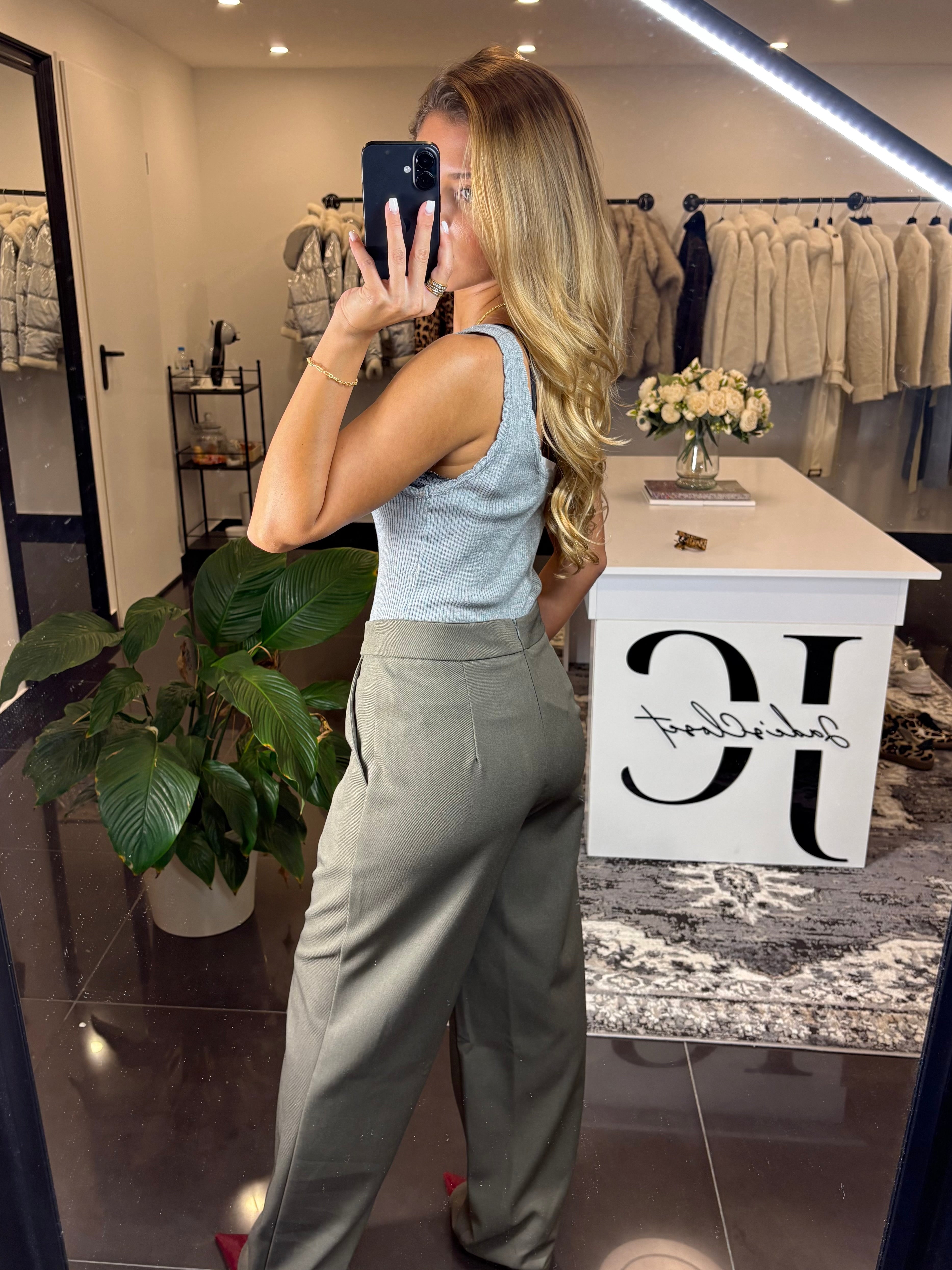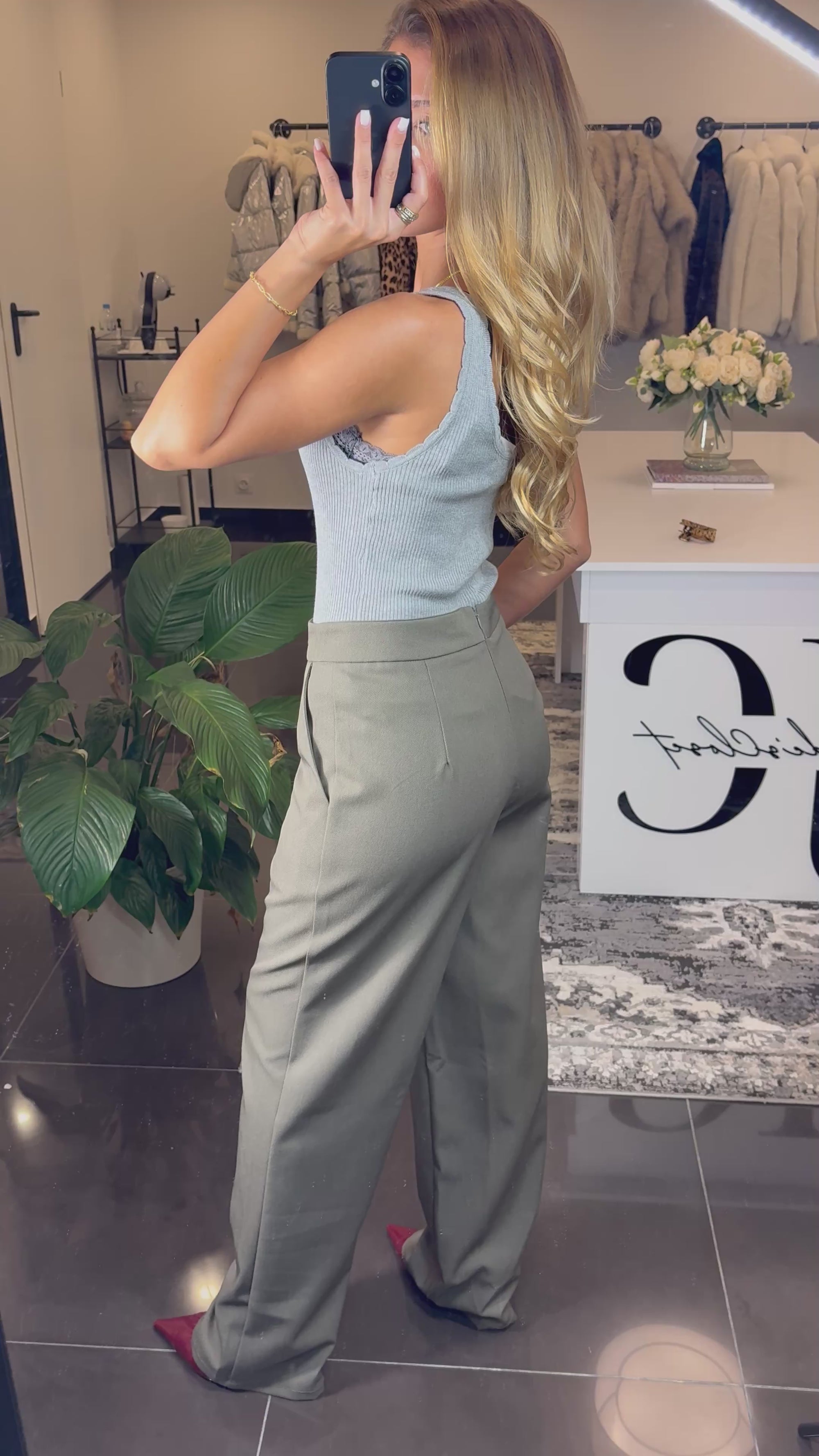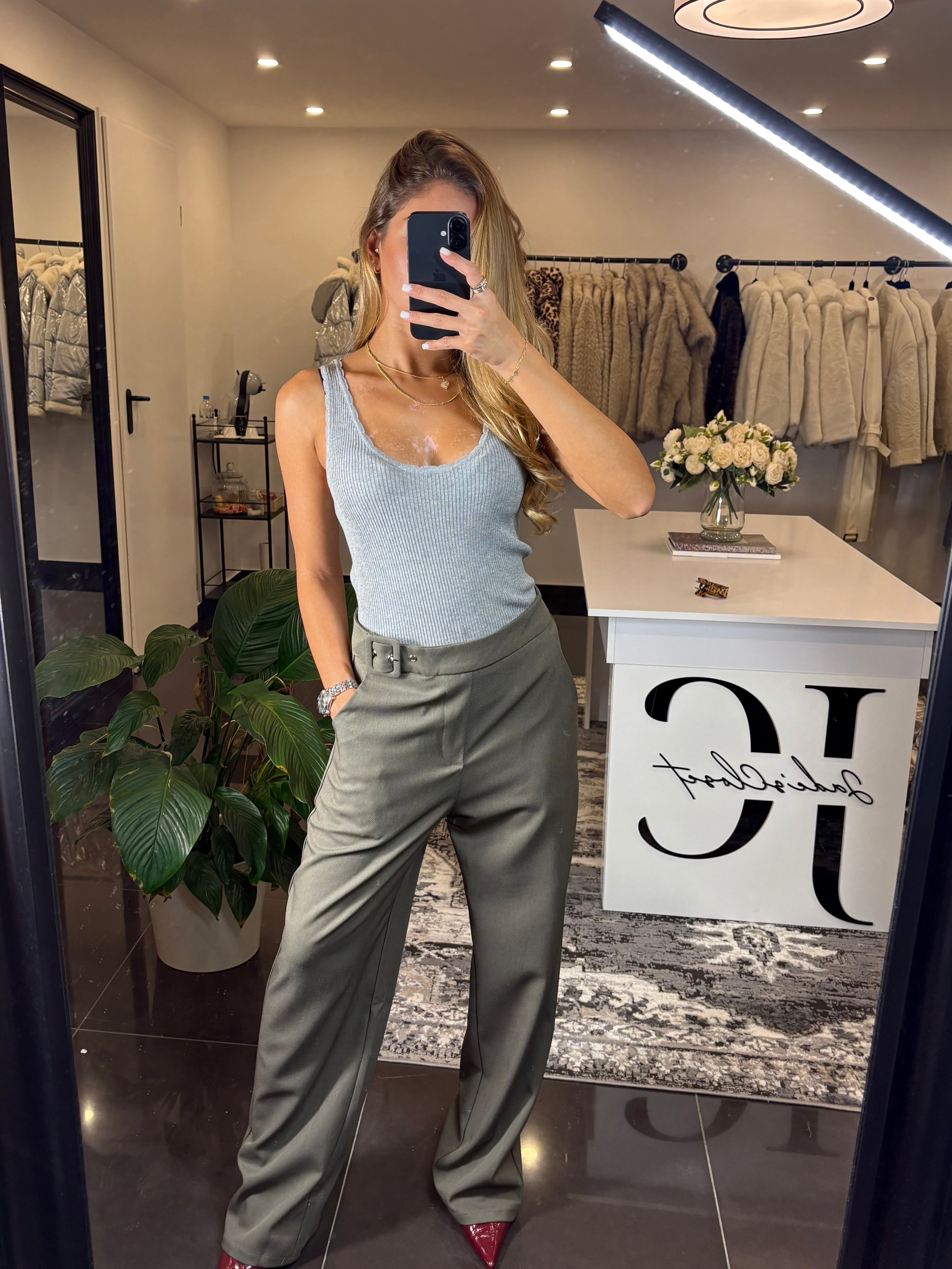 Moderne et élégant, ce pantalon se distingue par son détail boucle intégré à la taille qui souligne subtilement la silhouette. Confectionné dans une matière fluide et légèrement extensible, il combine confort et allure sophistiquée.
