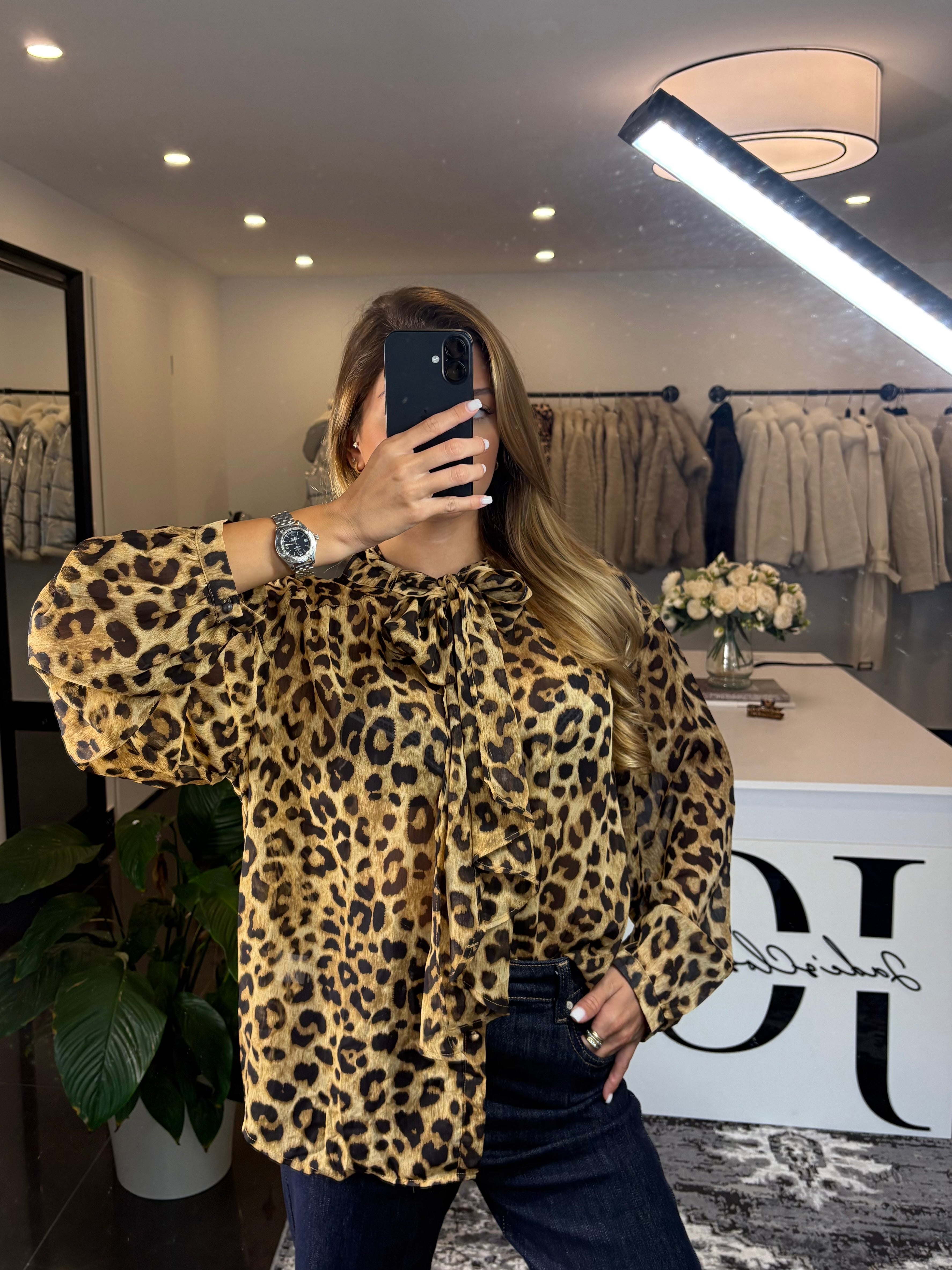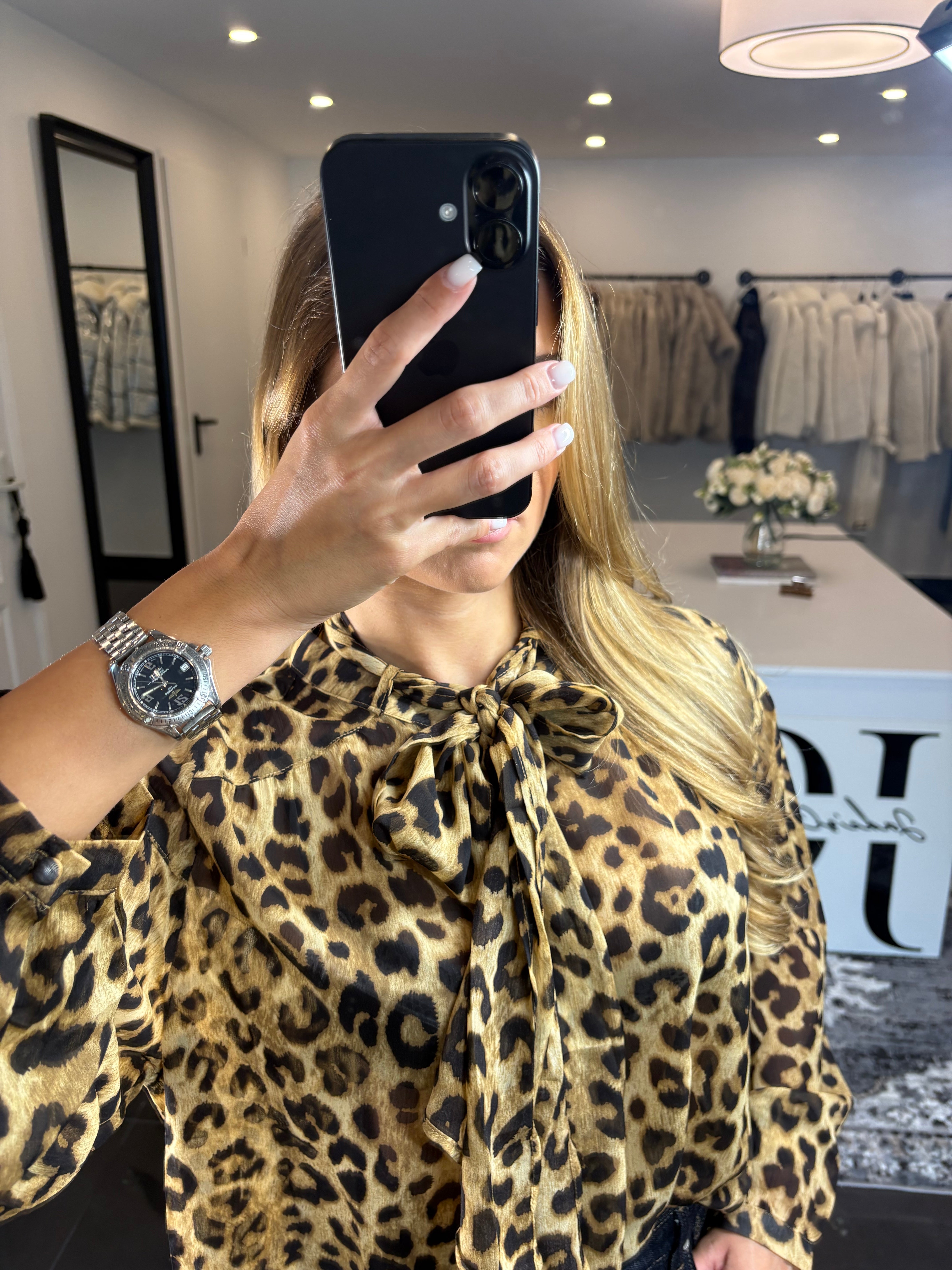 • Détails : col lavallière avec nœud à nouer à l’avant, manches longues, imprimé léopard