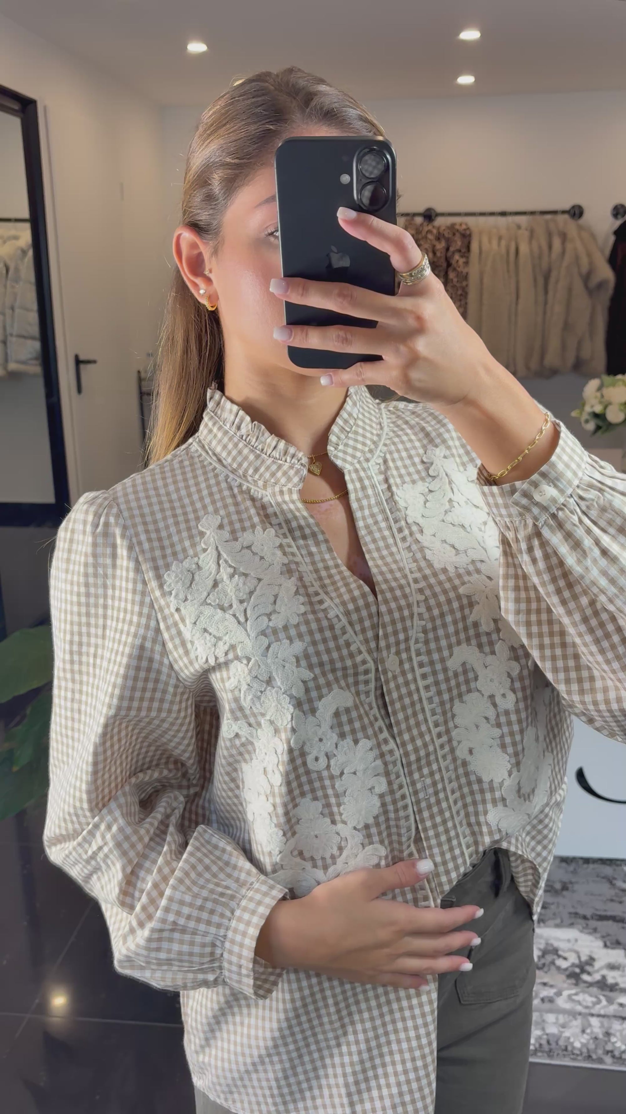 • Détails : motif vichy, broderies blanches sur le devant, col chemise, manches longues avec poignets boutonnés