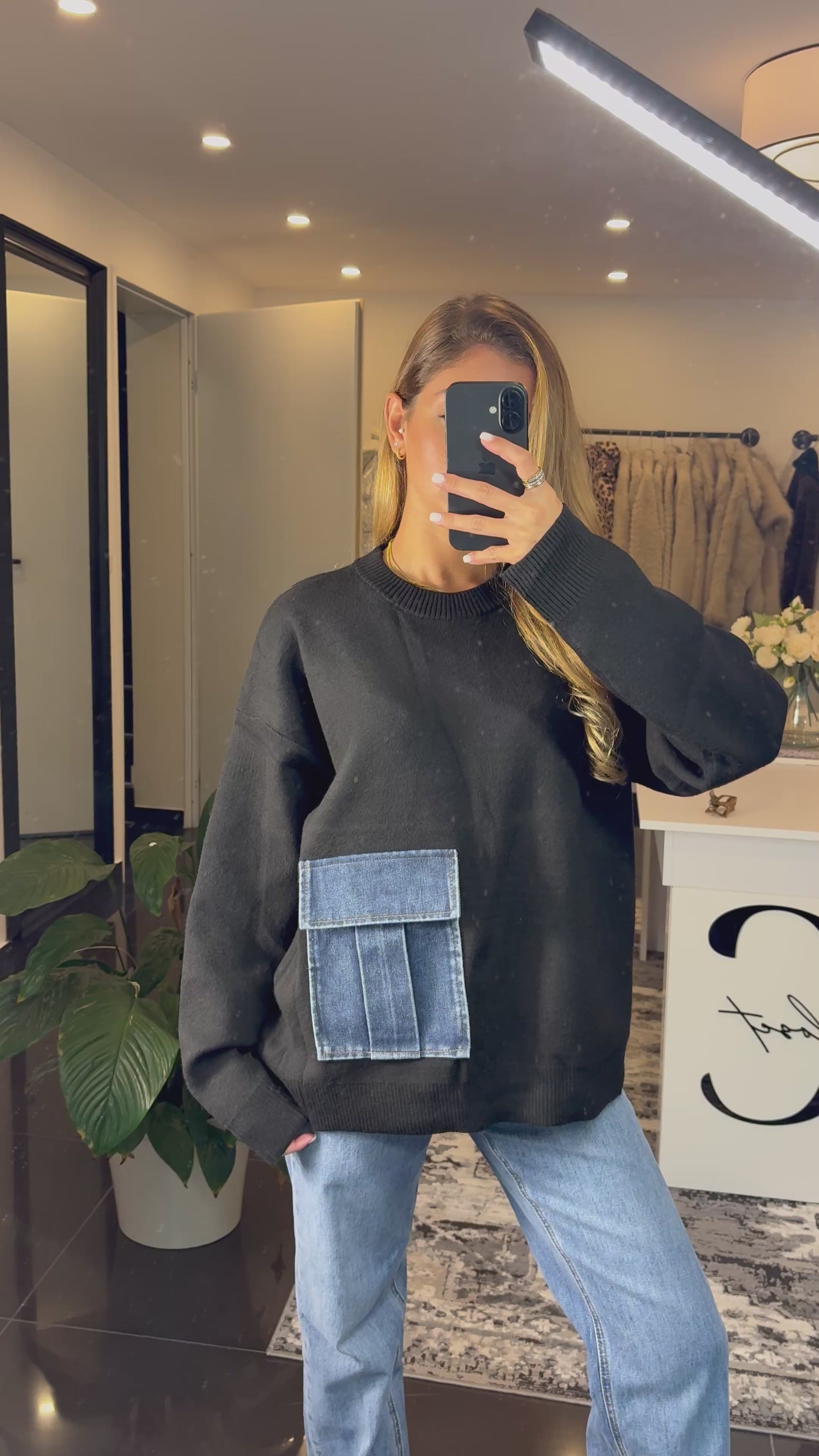Confortable et tendance, ce pull noir se démarque par son détail original : une grande poche en jean contrastée sur l’avant. Sa maille douce et chaude, enrichie de laine, en fait une pièce idéale pour un look casual moderne.